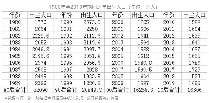 新生人口是母嬰行業(yè)基本盤中的基本盤。進(jìn)入21世紀(jì)以來(lái),這二十年間總共有多少人出生?隨著出生率逐年下降,00后和10后,相比80后和90后,究竟少了多少人?近日,第一財(cái)經(jīng)根據(jù)歷年統(tǒng)計(jì)公報(bào)、公開(kāi)數(shù)據(jù)統(tǒng)計(jì)梳理發(fā)現(xiàn),我國(guó)80后、90后、00后、10后人數(shù)分別為2.21億、2.08億、1.63億(16258萬(wàn))、1.63億(16306萬(wàn))。