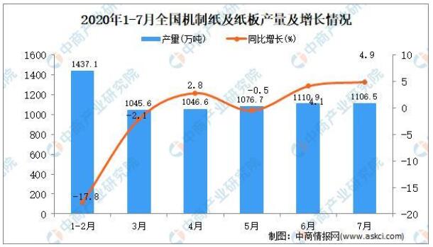 根據(jù)中國輕工業(yè)信息中心數(shù)據(jù)顯示,2020年1-7月,全國機制紙及紙板產(chǎn)量6843.8萬噸,同比下降3.3%。7月當月,全國機制紙及紙板產(chǎn)量1106.5萬噸,同比增長4.9%。