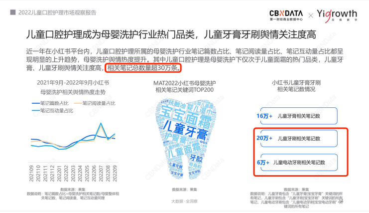 具體來看,相關(guān)筆記總數(shù)量超30萬條。其中,關(guān)于兒童牙刷(包括傳統(tǒng)和電動(dòng))的筆記共有26萬+。也正因此,我國兒童基礎(chǔ)口腔護(hù)理產(chǎn)品(包括牙刷和牙膏)的滲透率正在逐步提升,2016年只有28.4%,預(yù)計(jì)到2022年將達(dá)到38.7%。