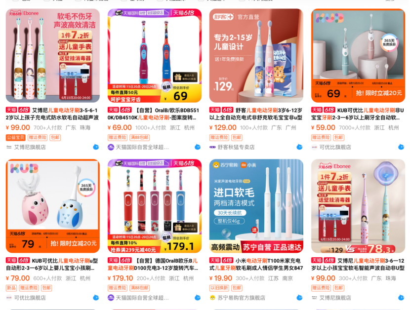 紅利顯現(xiàn)下,兒童牙刷也成為一眾企業(yè)布局的重要賽道。其中,我們看到歐樂B、青蛙王子、獅王、舒克等國內(nèi)外老品牌,usmile等新興品牌,以及NUK、babycare等母嬰品牌。除此之外,還有許許多多不知名的品牌,在該領(lǐng)域上演著“千刷大戰(zhàn)”。