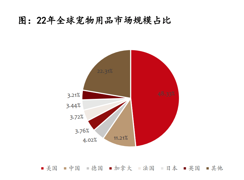 從國(guó)家層面來(lái)看,目前美國(guó)寵物用品市場(chǎng)規(guī)模排名第一,2022年美國(guó)寵物用品市場(chǎng)規(guī)模高達(dá)230.04億美元,占全球市場(chǎng)份額的48.33%。中國(guó)寵物用品市場(chǎng)規(guī)模僅次于美國(guó),2022年市場(chǎng)規(guī)模為53.45億美元,占全球市場(chǎng)份額的11.21%;英國(guó)、德國(guó)、日本、法國(guó)、加拿大也是重要的寵物用品消費(fèi)市場(chǎng),根據(jù)歐睿國(guó)際的數(shù)據(jù),22年德、加、法、日、英的寵物用品的市場(chǎng)份額分別為4.02%、3.76%、3.72%、3.44%、3.21%。