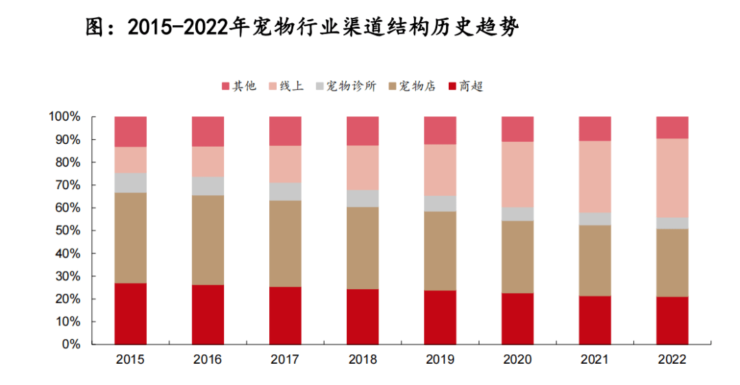 從渠道端來(lái)看,隨著電商平臺(tái)的高速發(fā)展,寵物用品銷(xiāo)售渠道線上化強(qiáng)勢(shì)。寵物用具銷(xiāo)售渠道豐富,線下銷(xiāo)售渠道可細(xì)分為商超、寵物店、寵物醫(yī)院診所等渠道,