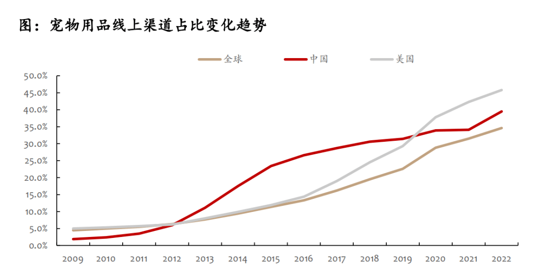 隨著電商平臺(tái)的迅猛發(fā)展以及線上購(gòu)物的便捷性,寵物用品線下銷(xiāo)售渠道占比有所下降,而線上渠道占比持續(xù)提升。根據(jù)歐睿國(guó)際的數(shù)據(jù)顯示,全球?qū)櫸镉闷肪€上渠道占比由2013年的7.7%增長(zhǎng)至2022年的34.6%,13-22年規(guī)模CAGR高達(dá)18.17%。