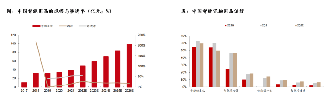 一是智能化:數(shù)據(jù)顯示,2017-2021年中國(guó)寵物用品市場(chǎng)規(guī)模分別為9.8、31.4、32.1、33.8、38.6億元,2017-2019年CAGR高達(dá)40.9%,預(yù)計(jì)到2026年,寵物智能用品有望達(dá)到98.1億元。