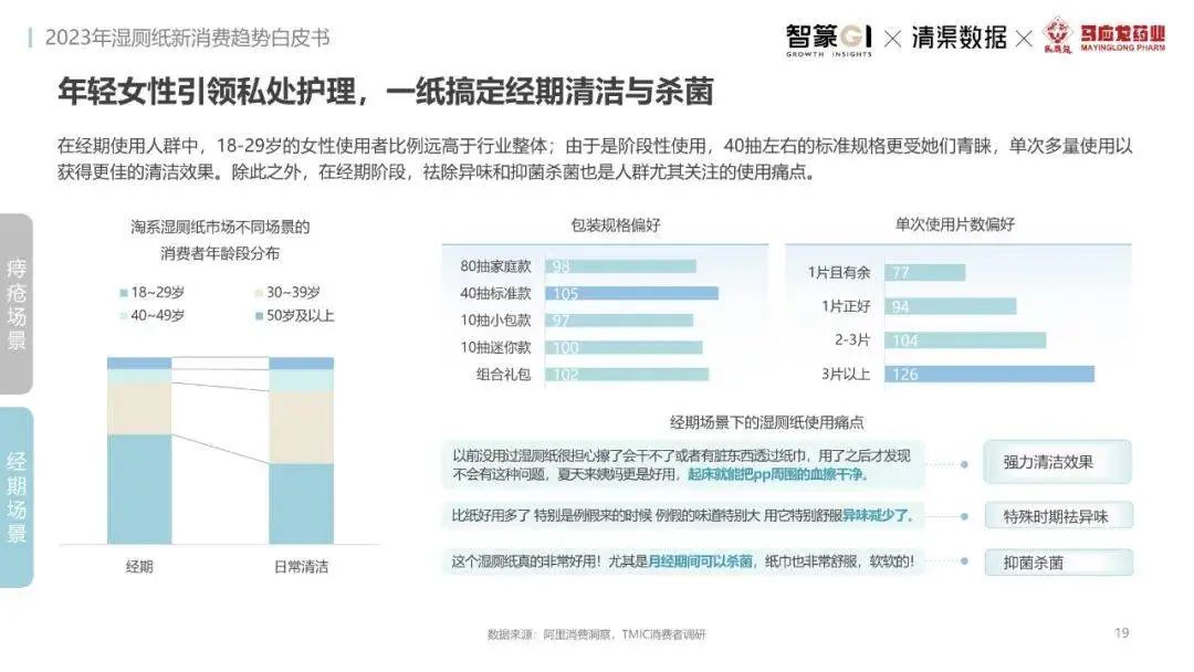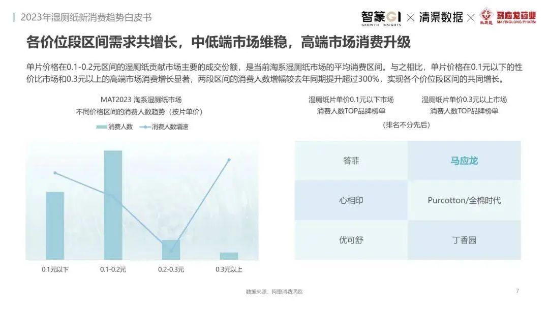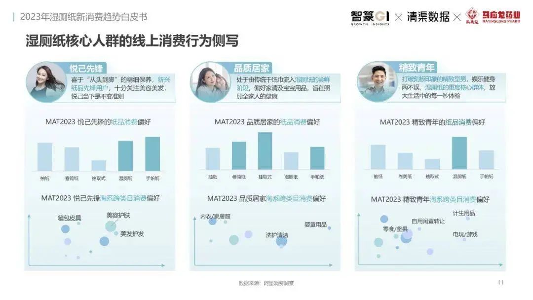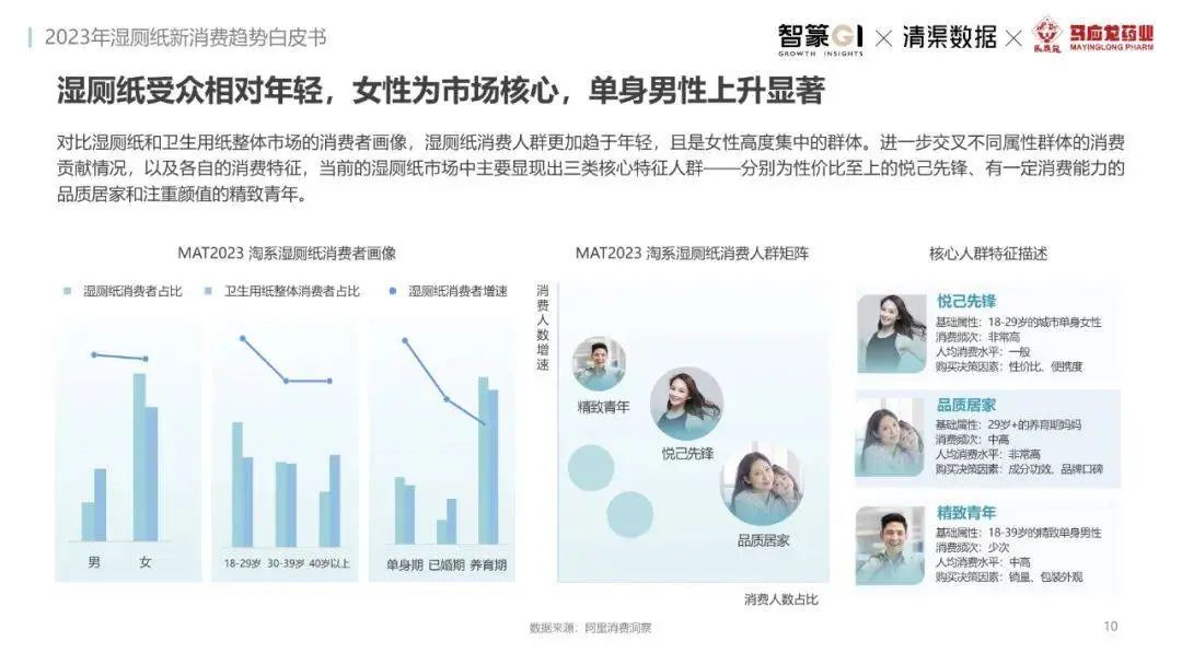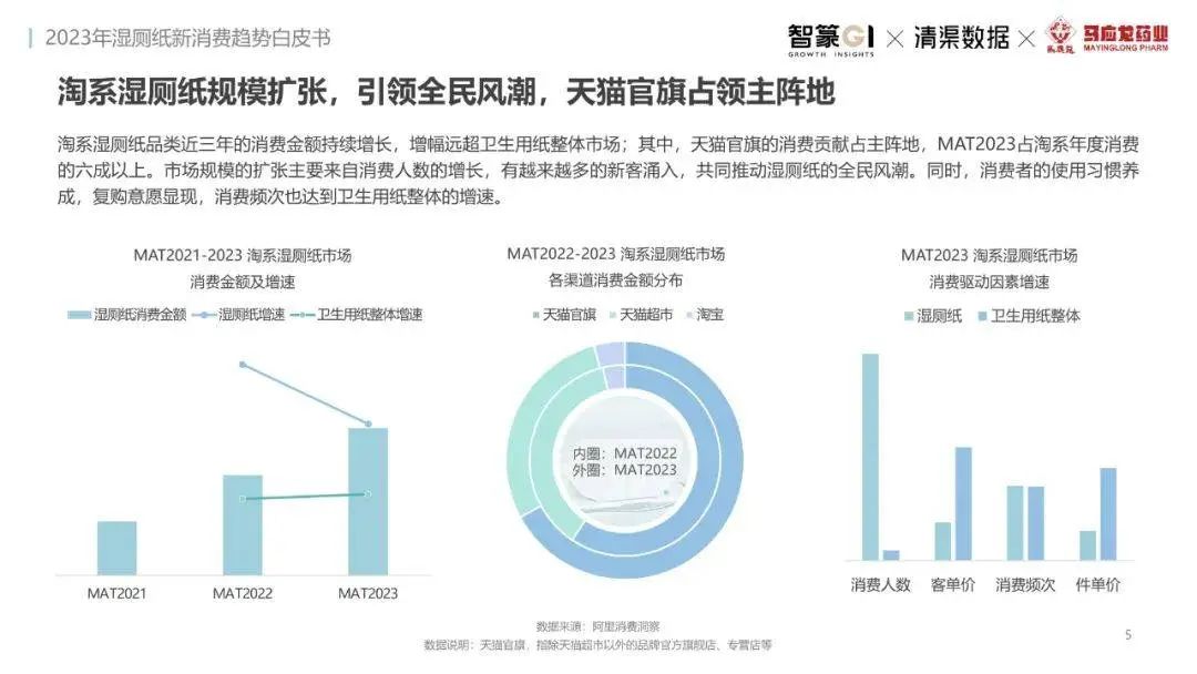 淘系濕廁紙品類近三年的消費金額持續(xù)增長,增幅遠(yuǎn)超衛(wèi)生用紙整體市場,其中,天貓官旗的消費責(zé)獻占主陣地,MAT2023占淘系年度消費的六成以上,市場規(guī)模的擴張主要來自消費人數(shù)的增長,有越來越多的新客涌入,共同推動溫廁紙的全民風(fēng)潮,同時,消費者的使用習(xí)慣養(yǎng)成,復(fù)購意愿顯現(xiàn),消費頻次也達到衛(wèi)生用紙整體的增速。