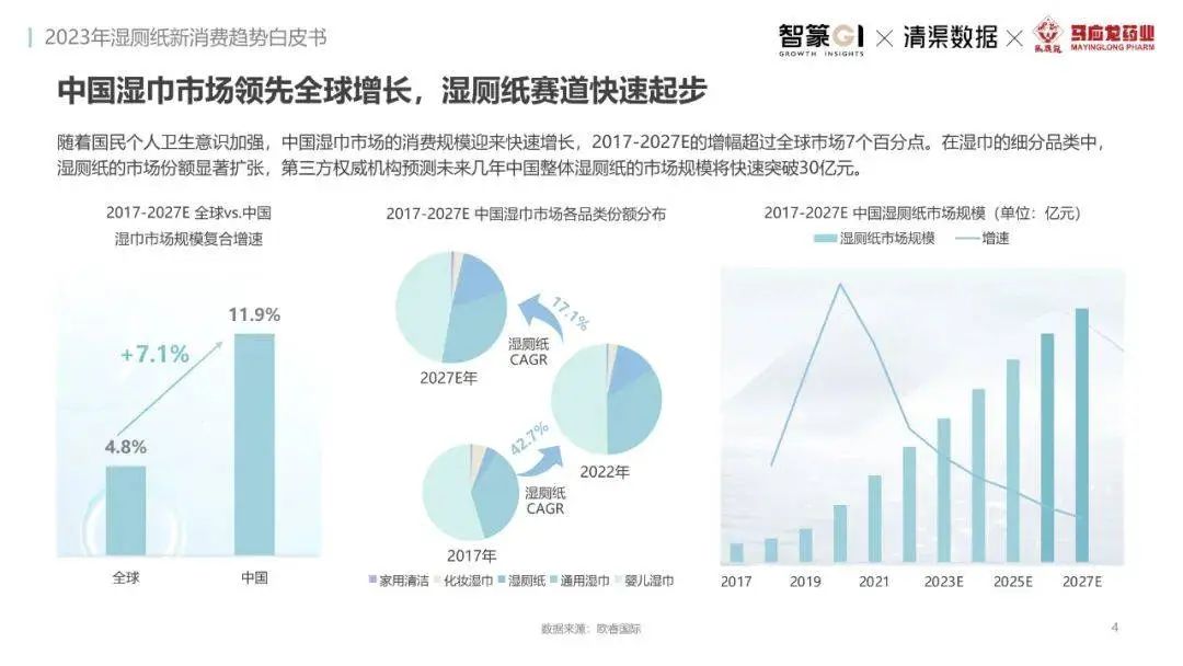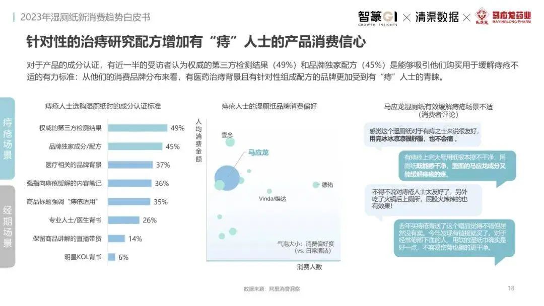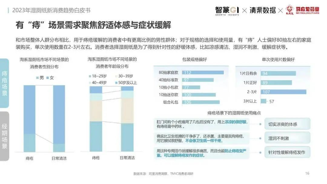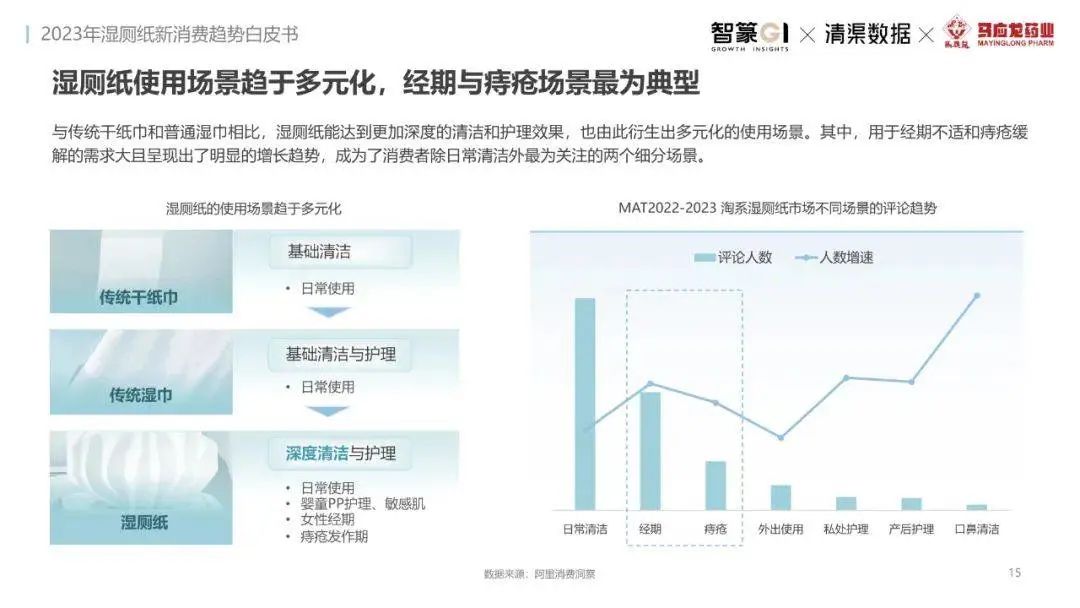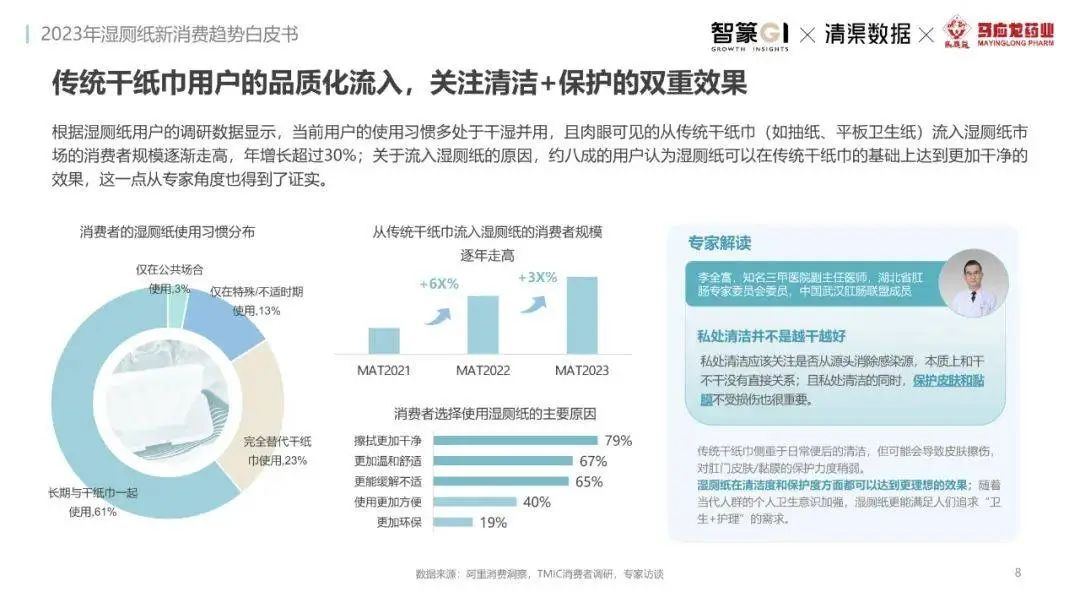 淘系濕廁紙品類近三年的消費金額持續(xù)增長,增幅遠(yuǎn)超衛(wèi)生用紙整體市場,其中,天貓官旗的消費責(zé)獻占主陣地,MAT2023占淘系年度消費的六成以上,市場規(guī)模的擴張主要來自消費人數(shù)的增長,有越來越多的新客涌入,共同推動溫廁紙的全民風(fēng)潮,同時,消費者的使用習(xí)慣養(yǎng)成,復(fù)購意愿顯現(xiàn),消費頻次也達到衛(wèi)生用紙整體的增速。