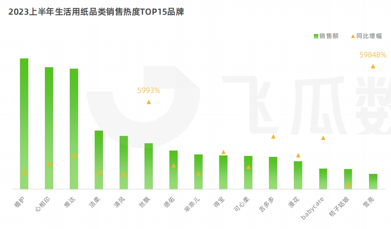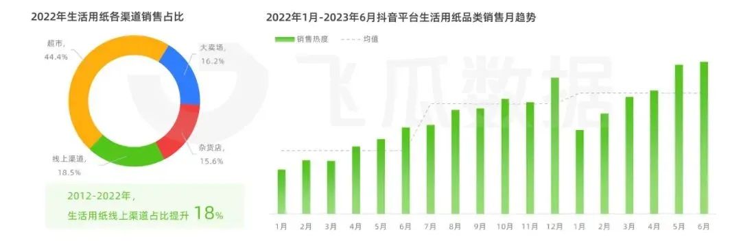 在各大電商平臺中,抖音電商表現(xiàn)出強勁增勢,2023上半年生活用紙的品類銷售熱度較去年同期增長75.4%。
