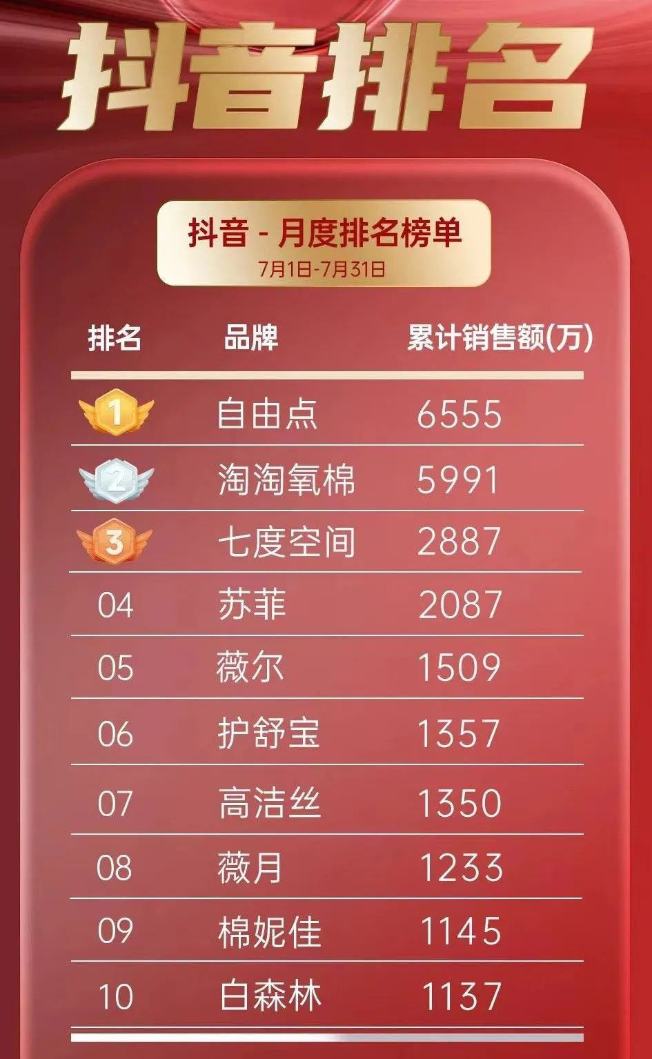 根據(jù)第三方數(shù)據(jù)平臺顯示,抖音平臺2024年7月份衛(wèi)生巾前十銷售榜單,其中,“自由點”品牌以6555萬元的銷售額高居榜首,展現(xiàn)出了強大的市場號召力和消費者認可度。